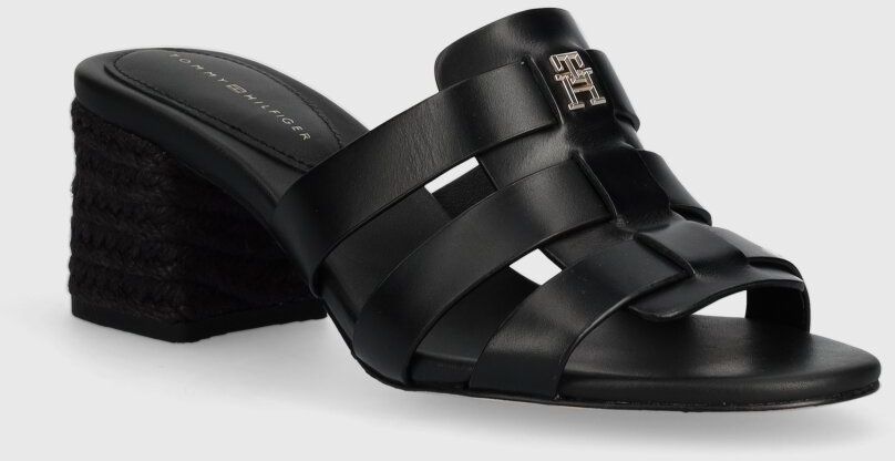 Kožené šľapky Tommy Hilfiger BLOCK MID HEEL LEATHER SANDAL dámske, čierna farba, na podpätku, FW0FW08049
